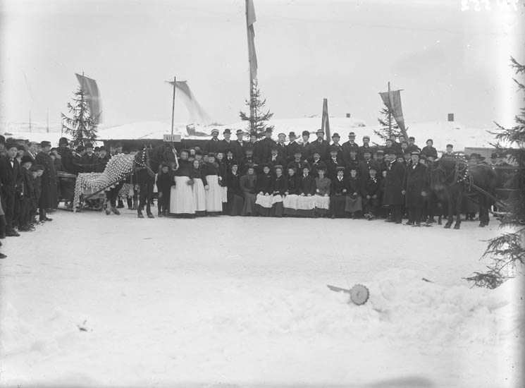 Enligt tidigare noteringar: "Gruppbild, vinterfest utomhus, hästar med slädar."
