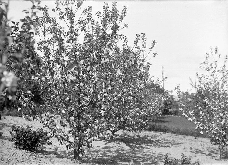 Enligt senare noteringar: "Fruktträd under blomning i doktor Knut Sundbergs trädgård, belägen i Munkedals stationssamhälle." (BJ)