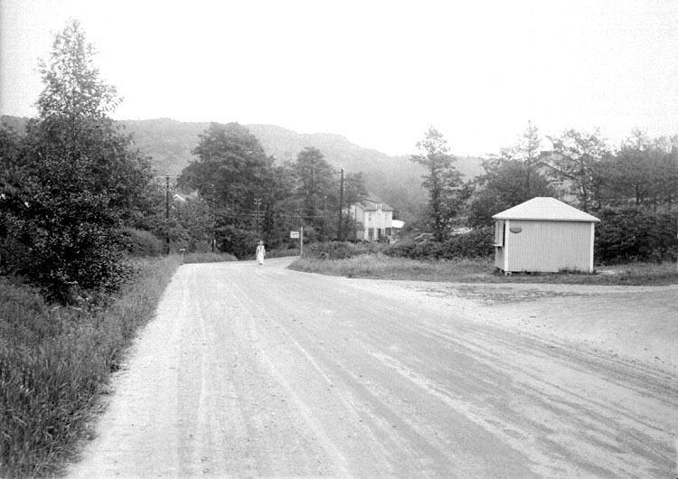 Enligt senare noteringar: "Lundströms kiosk vid Kvistrum. Trädgårdsmästare Lundström på Åtorp, hade konfektyr och läskedryckskiosk utanför Oscar Färdigs hus några år på 1930-talet. Vid flickan på vägen Munkedals gummiverkstadsskylt och huset där bakom är Gabrielssons bilverkstad." (BJ)