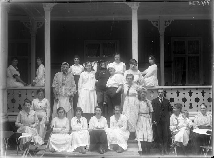 Enligt tidigare noteringar: "Gruppbild på verandan på Gustafsberg, mest damer, några utklädda."