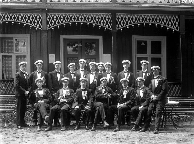Enligt tidigare noteringar: "Gruppfoto av 1919 års studenter i Uddevalla i Grand Hotells trädgård."