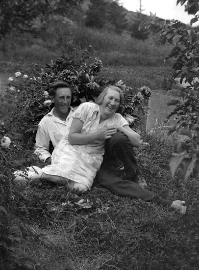 Ett par sitter tillsammans på marken i en trädgård