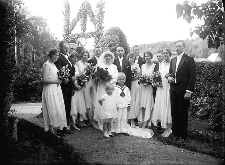 Enligt senare noteringar: "Brudparet Gösta Hugo Ramsten (Norrköping) och Linnea f. Moberg, Torreby, tillsammans med tärnor och marskalkar.