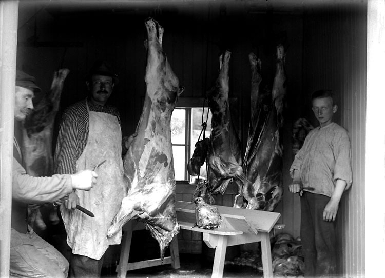 Enligt senare noteringar: "Interiör från slaktare Larssons slakteri på Stale. Larsson var smålänning och drev slakteri och butik under många år. Pojken är sonen i huset, Rudolf, senare anställd på Munkedals bruk. Kortet taget den 5 augusti 1922." (BJ)
