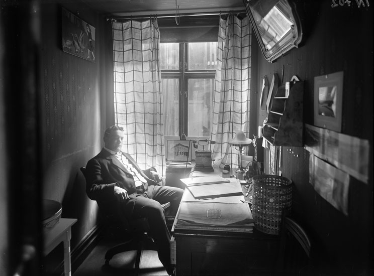 Enligt tidigare noteringar: "Kontorsrum. Edw. Schlaugs vid sitt skrivbord. Eskilstunaboden."