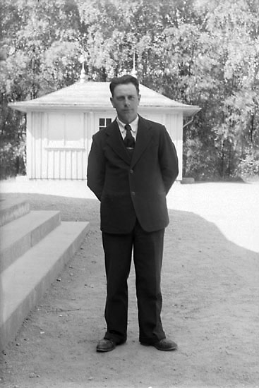 Enligt noteringar: "Man bredvid trappan till dansbanan. Bakom mannen kioskbyggnaden. Mannen är troligen Henry Ståhlfors." (BJ)
