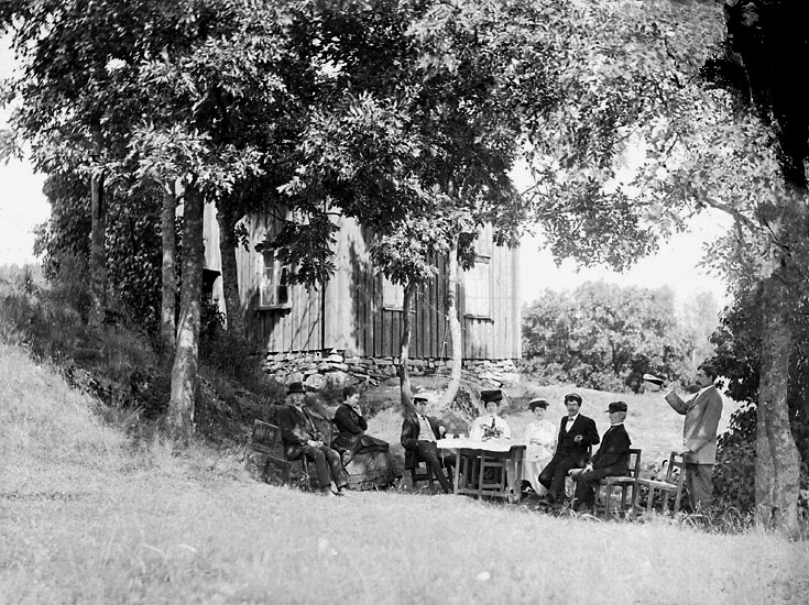 Enligt senare noteringar: "Från vänster: Herman Olsson med fru Margreth, Alf Winberg Annie Olsson, Tekla Elving, Anton Olsson och Elo Nelson. Elo Nelson var ägare till Kvistrum." (BJ)