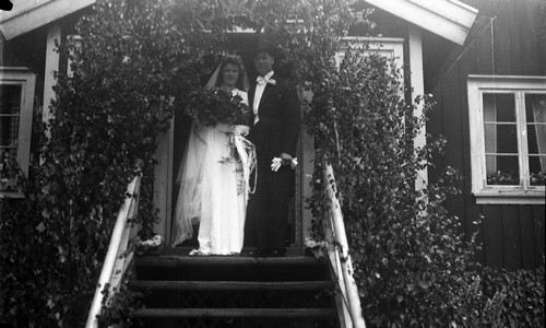 Brudpar på lövad verandatrappa