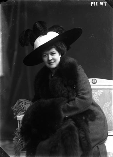 Enligt senare noteringar: "Ateljéfoto av kvinna med kappa, stor hatt, boa och muff."
