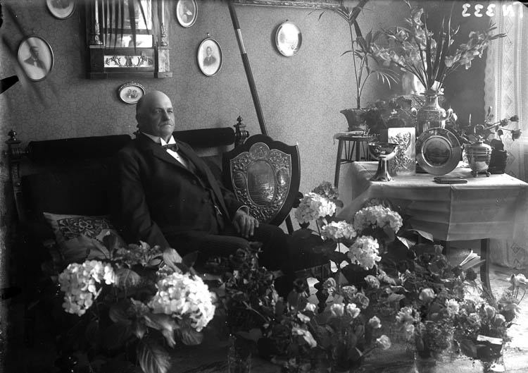Enligt tidigare noteringar: "Fiskhandlare Karl Rasmusson i sitt hem, fotograferad med blommor och presenter vid högtidsdag."