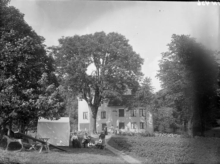 Enligt tidigare noteringar: "Bostadshus på landsbygden. Trädgård med tält, gunghäst, gungbräda, barn med får, personer framför huset."