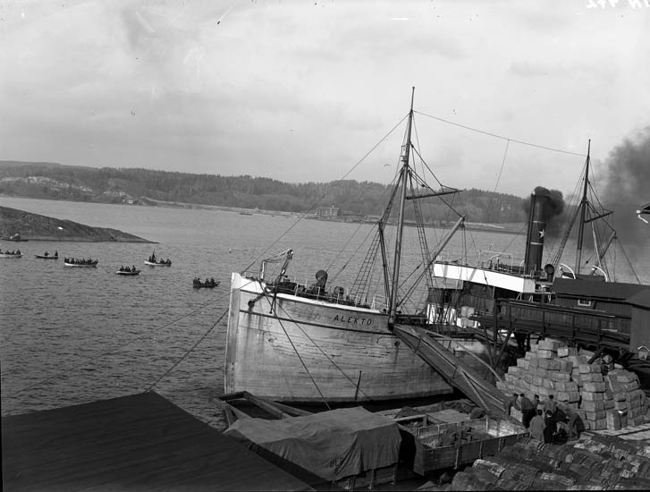 Enligt tidigare noteringar: "Träångfartyget Alekto vid Badö, Uddevalla. Flera robåtar med många människor."
