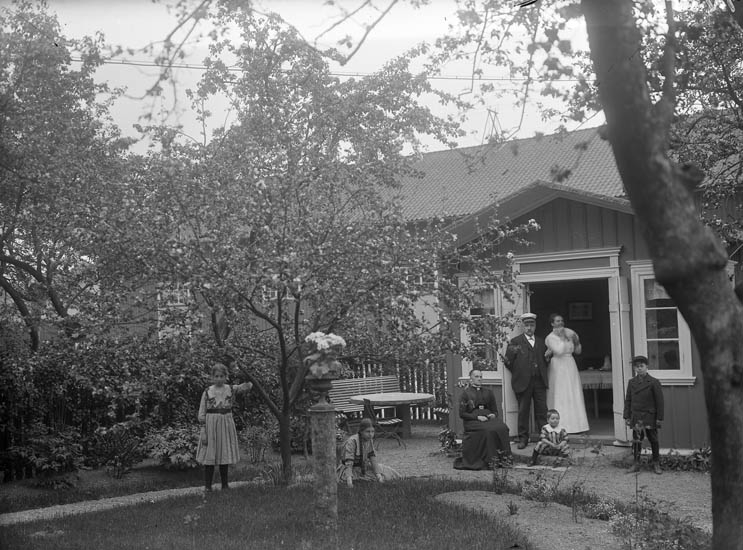 Enligt tidigare noteringar: "Trädgårdsidyll. Gruppfoto i trädgård framför verandaentre."