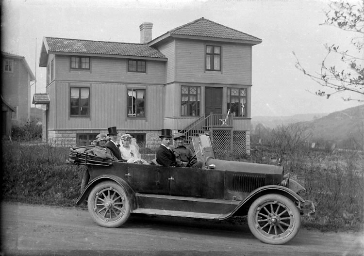 Brudpar i bil utanför Oscar Färdigs bostad, Munkedal