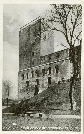 Notering på kortet:Kolding. Koldinghus Ruiner med det restaurerade Taarn..