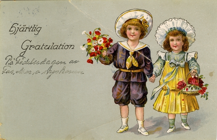 Notering på kortet: Hjärtlig Gratulation. På Födelsedagen av Far, Mor o syskon.