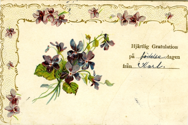 Notering på kortet: Hjärtlig Gratulation på födelsedagen från Karl.