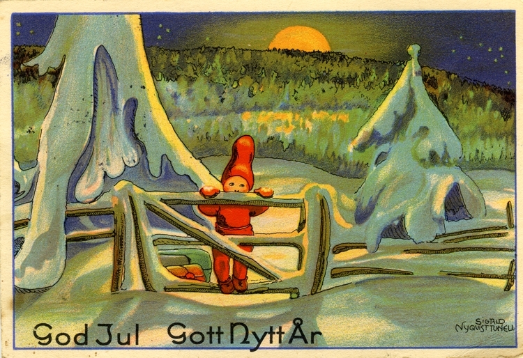Kort: "God Jul Gott Nytt År". Tomte står med paket vid en grind i ett snötäckt landskap.