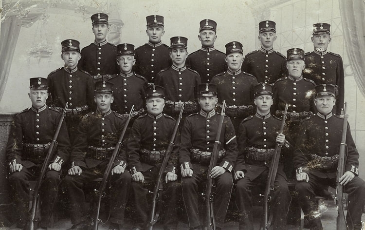 Enligt Bengt Lundins noteringar: "Ateljefoto av halv trupp med korpral".
