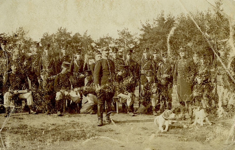 Enligt Bengt Lundins noteringar: "Gruppbild med befäl och hundar".
