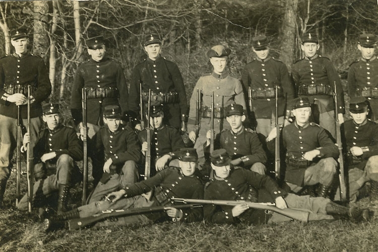Enligt Bengt Lundins noteringar: "Gruppbild med gevär, vid skogsbryn".