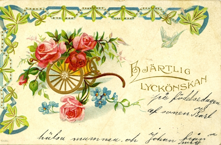 Notering på kortet: Hjärtlig Lyckönskan på födelsedagen Af sonen Karl.