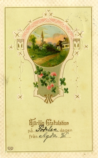 Notering på kortet: Hjärtlig Gratulation på födelsedagen från Agda W.