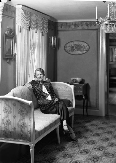 Interiör från huvudbyggnaden på Morlanda Säteri. Fru Karin Sanne sitter i lilla salongens soffa
