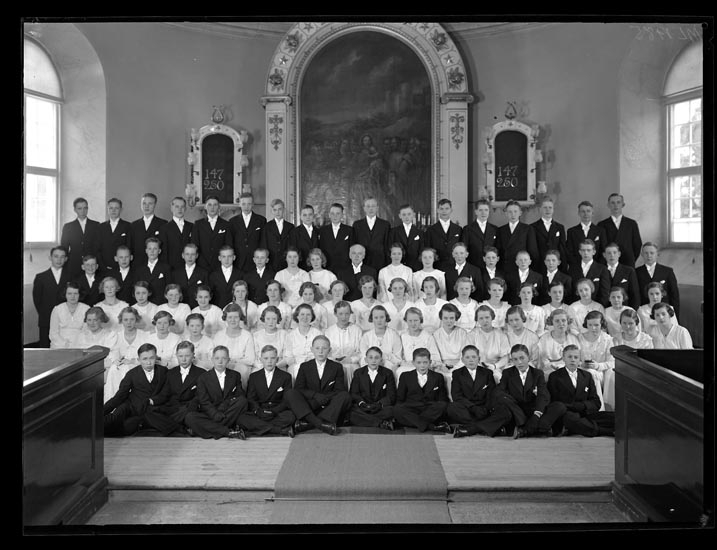 Uppgift enligt fotografen: "Uddevalla. Konfirmander. Stor grupp. Pastor Agner."