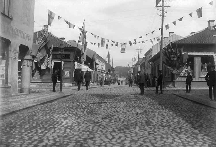 Enligt tidigare noteringar: "N. Drottninggatan mot norr. Flaggsmyckad gatukorsning. Kungsgatan med "Hallmans hörna", bokhandel till vänster."