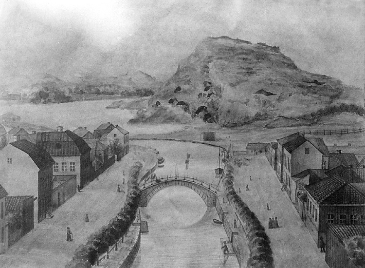 Enligt tidigare noteringar: "Avfotografering av litografi av danske konstnären Kierschou från 1856, motiv från Uddevalla. Bäveån och hamngatorna åt väster."