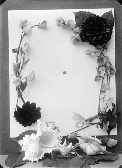 Enligt noteringar: "Stilleben, blommor med snäckor. Oscar Färdig hade några specialintressen inom fotografin. Nedanstående exempel belyser hans intresse för blommotiv." (BJ)