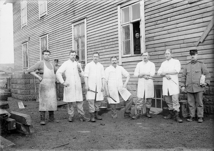 Enligt noteringar: "Ett lag kockar utanför den nybyggda kasernen vid Kvistrum. Kasernen byggdes under första världskriget som förläggning åt Kronobergs regemente, som hade bevakningsuppdrag i Munkedalstrakten.