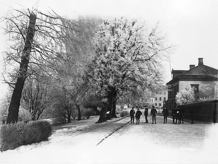 Enligt tidigare notering: "Vinterbild. Skolgossar framför Apoteket."