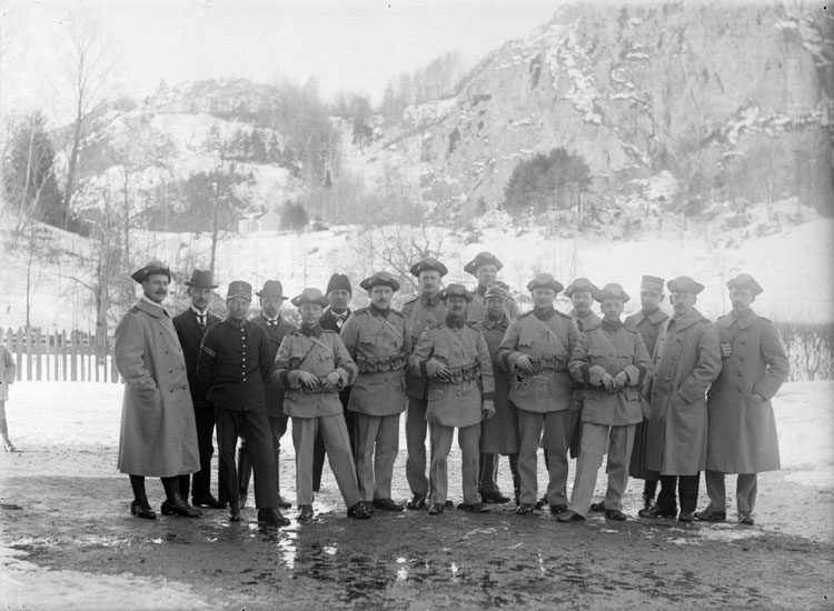 Enligt senare noteringar: "Grupp militärer, förmodligen landstormstrupp.Bilden troligen tagen i närheten av Kvistrum. Mannen i hatt är folkskollärare Victor Lindqvist. Lindqvist var förrådsförv. för Kvistrums landstormsområde." (BJ)