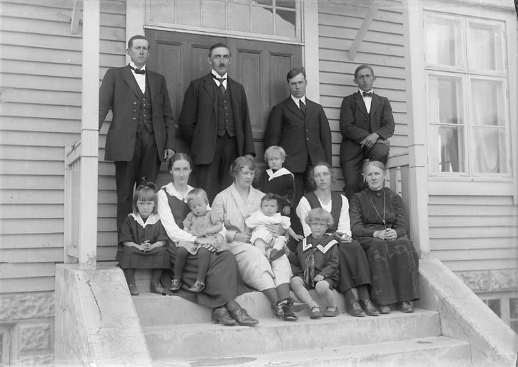 Andre man stående är smidesläraren Ivar Kjerrström. Andra kvinnan bland de sittande är fru Kjerrström, med sonen Stig i knät och stående bredvid sonen Curt. Stig dog endast 18 år gammal." (BJ)