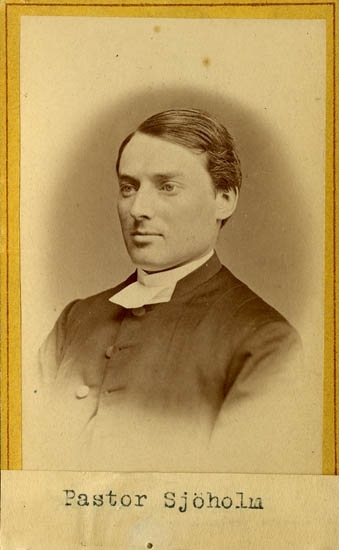 Text på kortets baksida: "Pastor Peter Johan Sjöholm, f i Hultsjö 1845. Prästvigd 1872.".