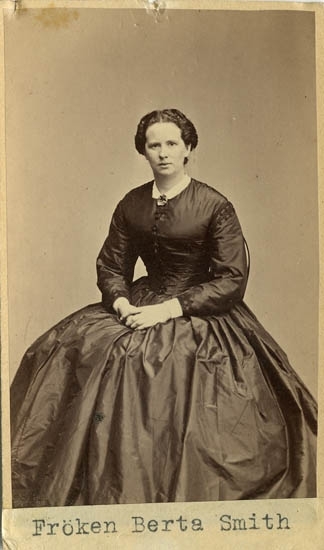 Text på kortets baksida: "Fröken Berta Rosanna Adelaida Smith, f. 1832. Dotter till Konsul Roger Wilhelm S. Född 1789 död 1856, handl. o skeppare sam rysk v. Konsul i Strömstad. G. 1821 med Sara Margareta Stiegler, f. 1800 d, 1838. Husmoder på Gustafsberg".
