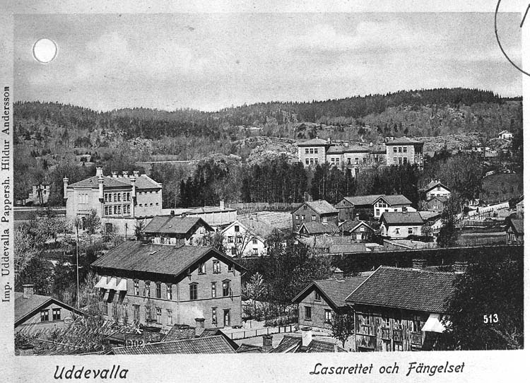 Text på kortet: "Uddevalla. Lasarettet och Fängelset".