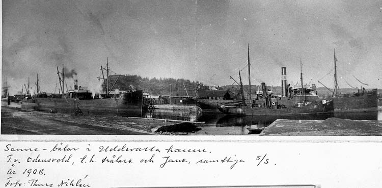 Text på kortet: "Sanne-båtar i Uddevalla hamn. T.v. Odensvold, t.h. trålare och Jane, samtliga s/s. År 1908. Foto Thore Nihlén".