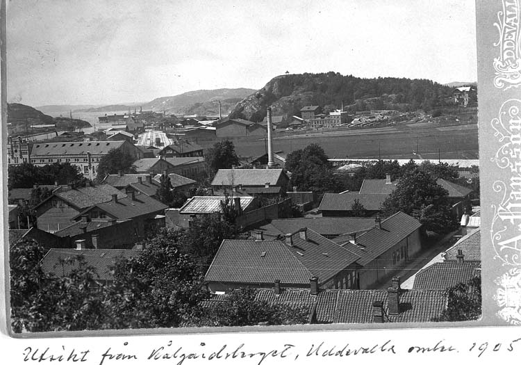 Text på kortet: "Vy över Hamnen, hamnbanestationen och Skansberget från Kålgårdsberget. I vinkelhuset med tre skorstenar i förgrunden föddes ärkebiskop Sundberg".