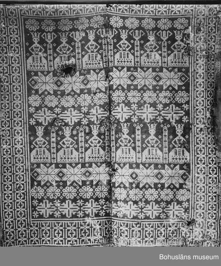 Täcke som i spegeln innehåller rader av fåvitska (oförståndiga) jungfrur med sina tända facklor och visa jungfrur längre ner med släckta facklor, stjärnor samt olika rosor. Bården har återkommande geometrisk form. Två vävda våder ihopsydda till ett täcke. Åtskilliga skador.
