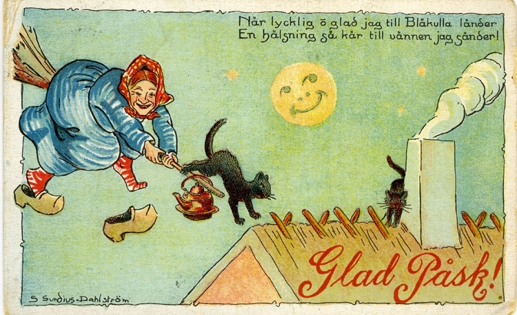 Kort: "När lycklig o glad jag till Blåkullan länder. En hälsning så kär till vännen jag sänder. Glad Påsk!" Påskkärring går ner för landning.
