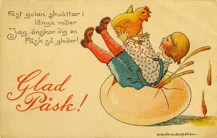 Påskhälsning med tryckt text: Fast gulan skvätter i långa rader. Jag önskar dig en Påsk så glader. Glad Påsk!