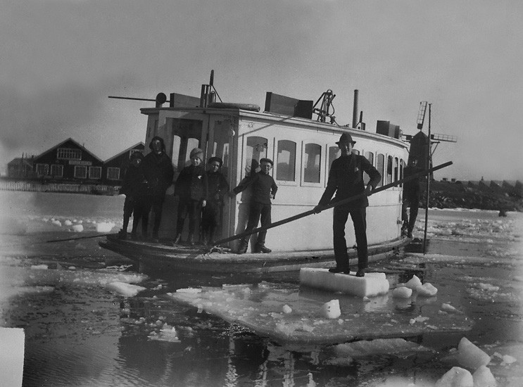 Män tar sig fram bland isflaken med färjan mellan Koön och Marstrand