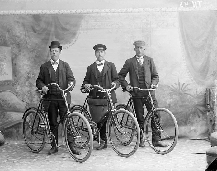 Enligt senare noteringar: "Ateljéfoto: tre herrar med velocipeder."
