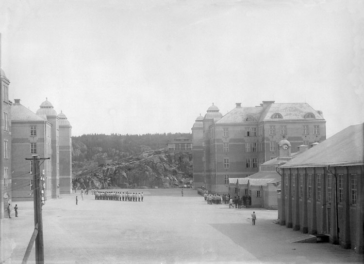 Enligt senare noteringar: "Bohusläns regemente, kaserngården fr. nordväst. Uppställning för utspisning."