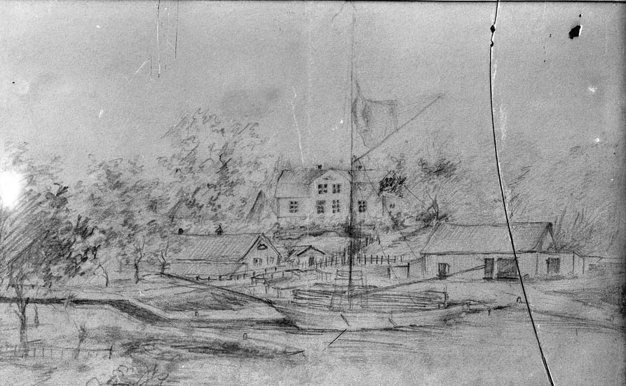 Enligt tidigare noteringar: "Foto av pennteckning: föreställande större villa och ekonomibyggnader vid kanal med trälastad skuta."