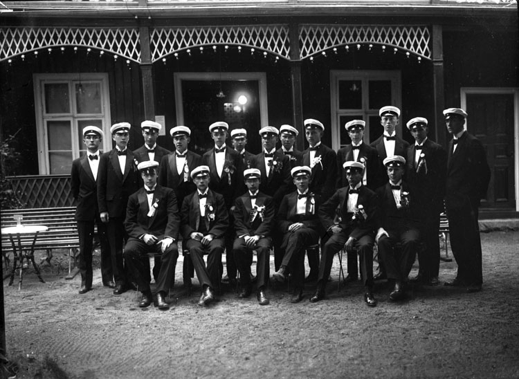 Enligt tidigare noteringar: "Gruppfoto av 1917 års studenter i Uddevalla i Grand Hotells trädgård."