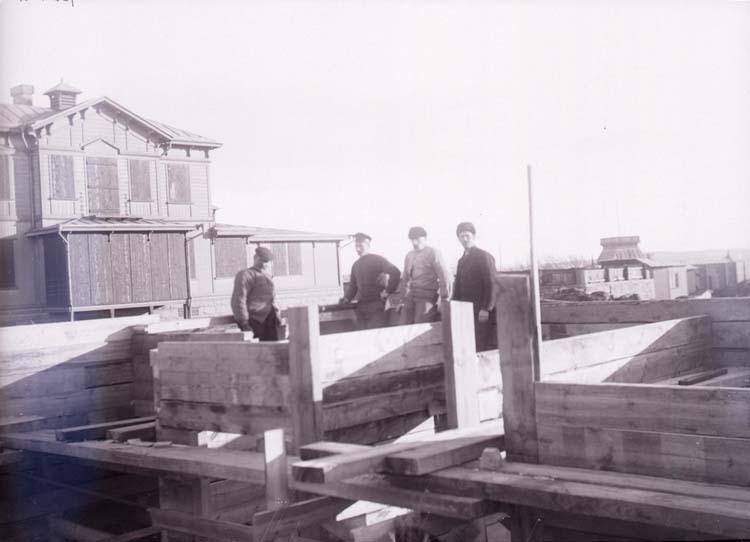 Enligt text som medföljde bilden: "Snickarna i stugan, Levin Carlsson, Edvard Börjesson, Johansson, Andersson febr.11."